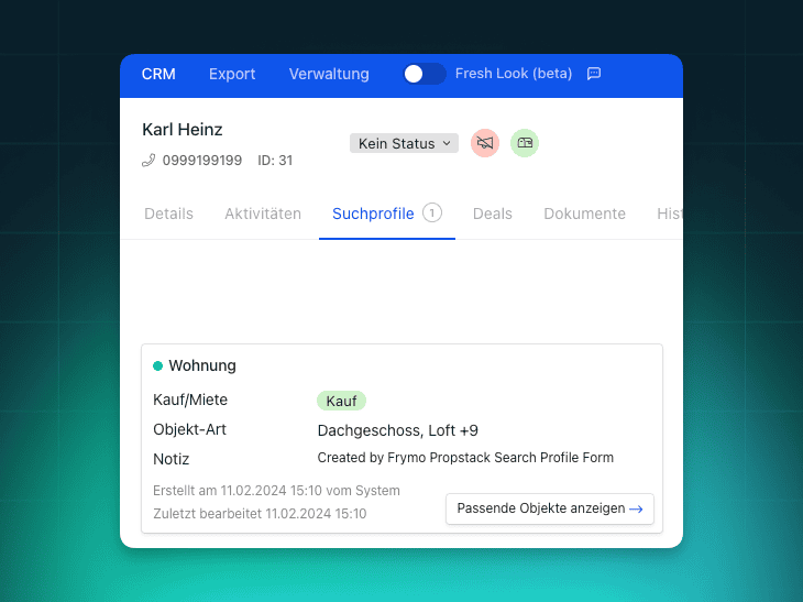 Interessenten tragen ihre Wünsche ein – dein CRM erstellt sofort ein Suchprofil