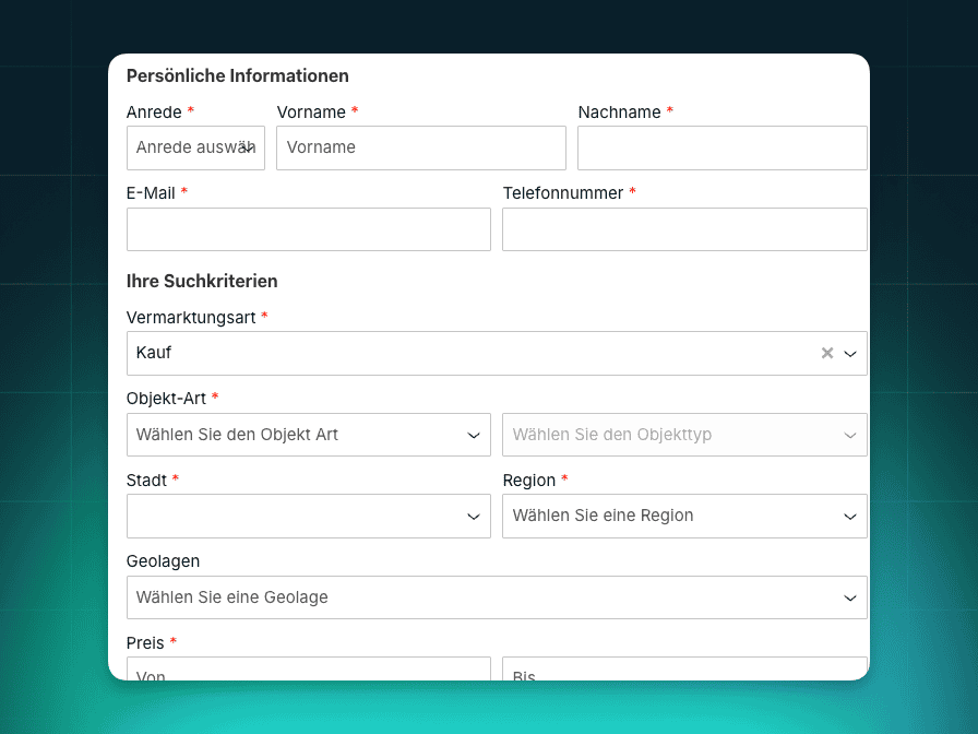 Mit dem Suchprofil-Formular können Besucher ihre Suchkriterien direkt auf deiner Website hinterlassen: gewünschte Lage, Budget, Zimmerzahl, Objektart und viele weitere Angaben.